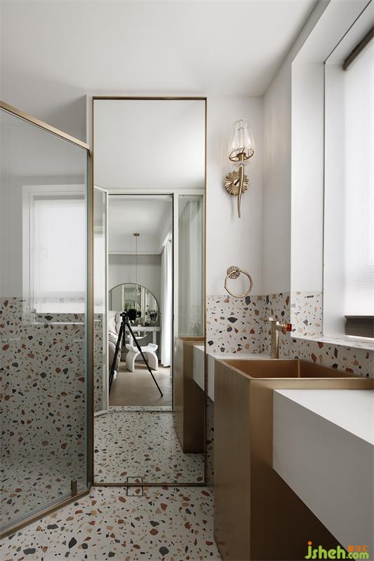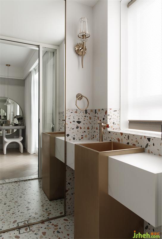 主卫的设计在客厅的材质选择上进行了延用,法式艺术设计不锈钢洗手盆与法式的水晶壁灯一同呼应,彩色的水磨石瓷砖将空间变得生动了起来。