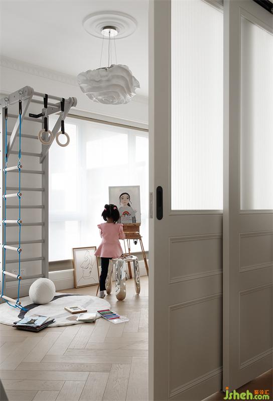 儿童房完美的隐藏在滑轨联动门的后面,国外原创冷门单品灯具,瞬间拉高了儿童空间的艺术调性。