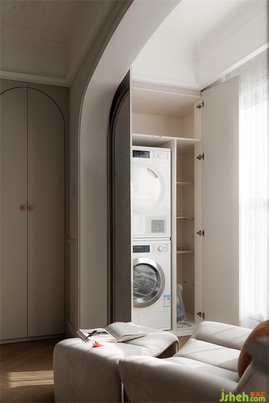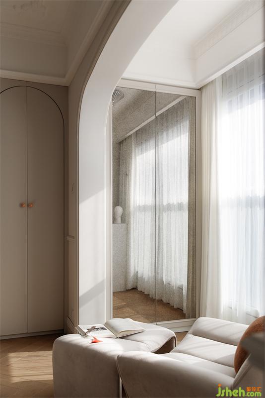 衣柜上的功能和入户类似,特意安排在房门后面和床尾过道相对,镜子的大面积使用既能扩展空间,又能有足够的距离作为更衣镜使用。
