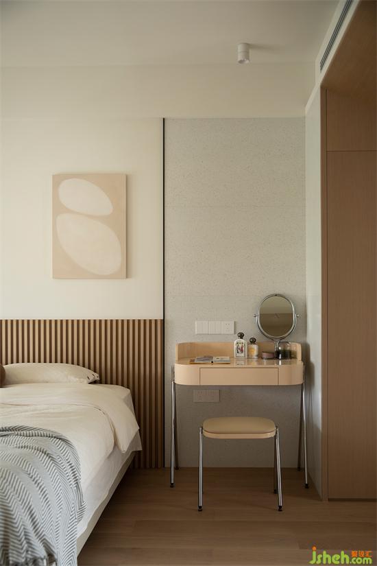 床头另一侧放置简易梳妆台,家装设计满足日常护肤需求,台面不大却也够用,有利于保持卧室清爽整洁度,避免脏乱。