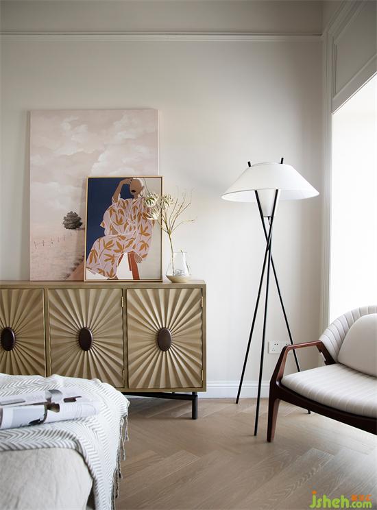 床尾摆放金色边柜,一大一小两幅装饰画错落而至,层次丰富更具艺术感,法式度假风设计浪漫的法式度假气息飘散在卧室每个角落。