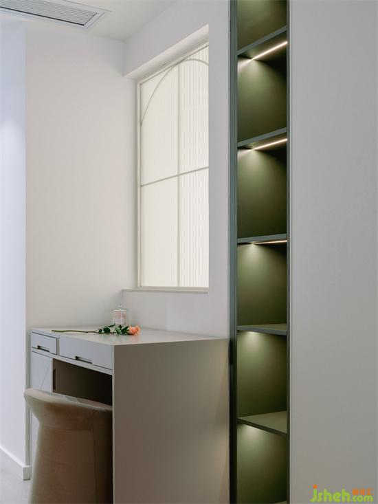 靠窗的位置定制一张梳妆台用以丰富空间功能,让屋主洗漱完后,就可以在这里完成梳妆、换衣的全部流程,有效缩短动线、提高生活效率。