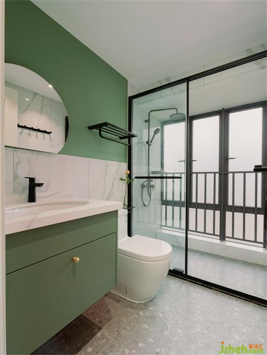 客卫将淋浴区放在卫生间内侧隔离,来划分为干湿两区。家装设计干区墙面与浴室柜依旧是时尚清新的绿色,与整体空间相呼应,配上灰色系水磨石地砖,更显低调高级。