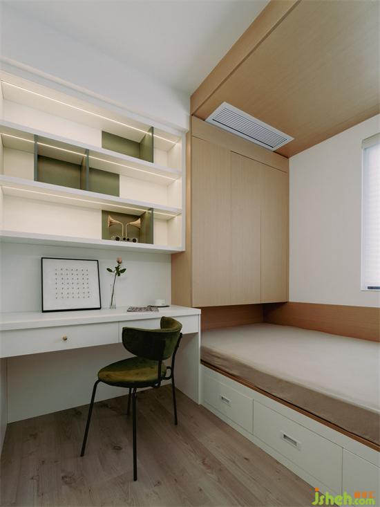 北面的小次卧设计成榻榻米床+组合衣柜+书桌的布局,满足休息、学习、收纳等需求,不管是作为备用的书房还是孩子的儿童房都很合适。