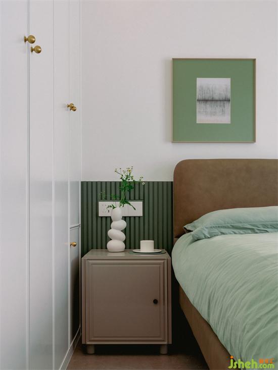 次卧延续了绿色的主色调,素雅纯净又不会让空间过于寡淡,为卧室增添些许惬意和生机,家装设计营造出自然宁静的睡眠氛围。