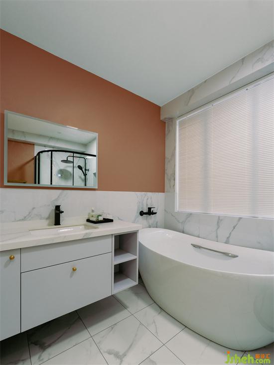 区别于满墙瓷砖的卫生间,主卫用半墙橙色防水漆与半墙瓷砖结合,增加卫生间墙面层次感,搭配白色系卫浴产品与大理石瓷砖,家装设计使空间呈现出简洁明快的感觉。