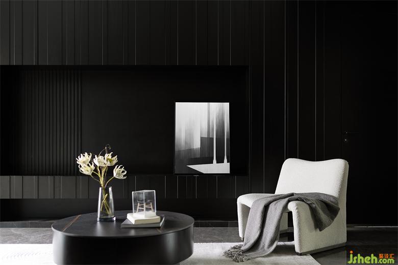 主沙发选择皮质,单人沙发则用羊羔绒材质,颗粒感呈现出柔和温馨,家装设计中和暗黑风的清冷。