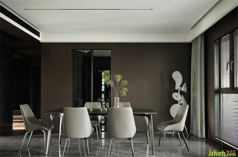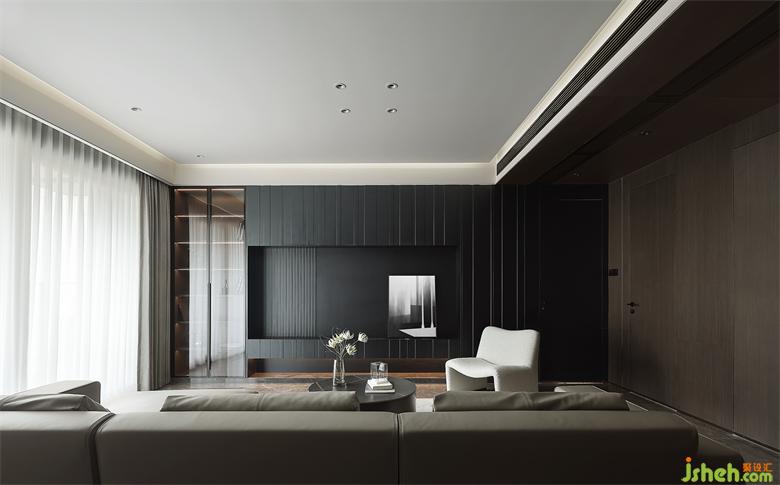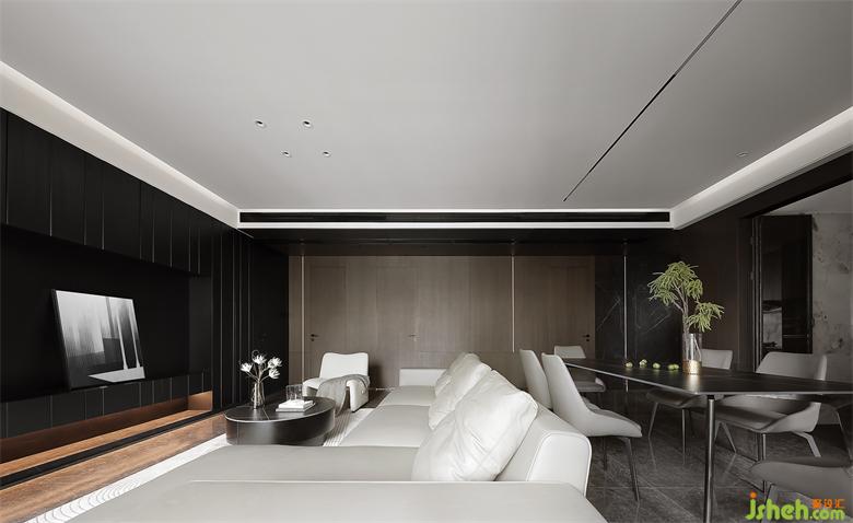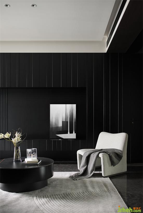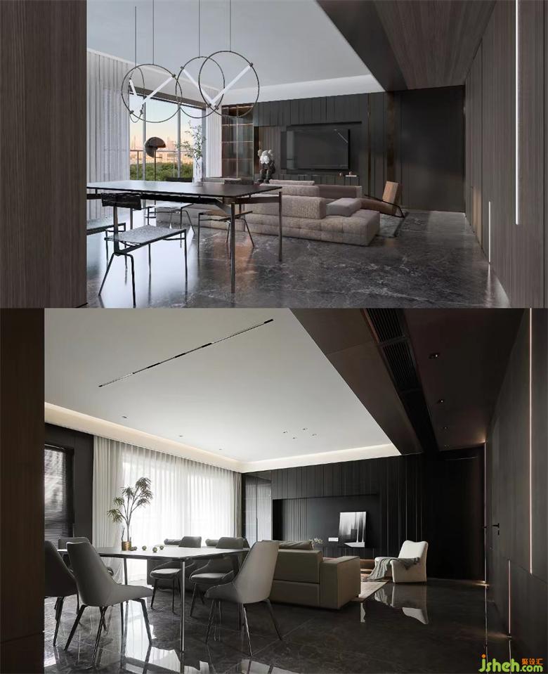 宽敞的公区一分为二,客餐厅融合且独立,空间交流融洽又不显杂乱。家装设计毫无疑问的无主灯设计,主吊顶选择留白处理,避免压抑逼仄,其余墙面及顶部均以不同材质饰面板覆盖,将暗黑风的质感彰显得淋漓尽致。