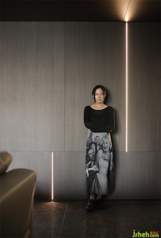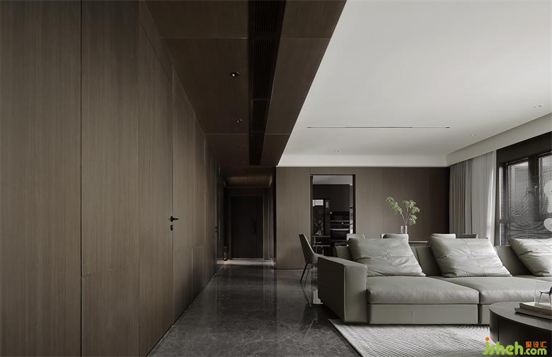木饰面拼接随意,内嵌灯条展示出错落的高级感,这样的线条也让门洞更加隐性。
