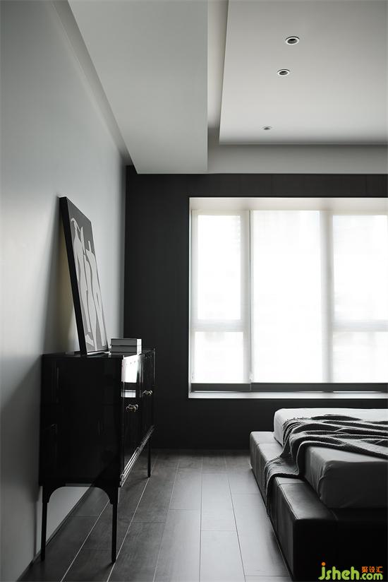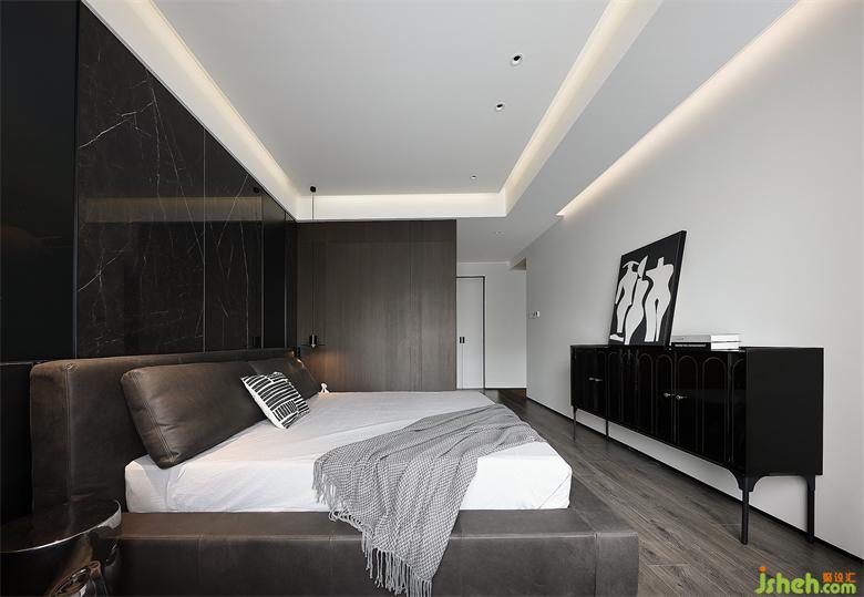 呼应整体风格,地板也选用灰黑色,与木饰面保持统一。家装设计床尾放置斗柜,柜门是黑色镜面质感,不同材质丰富空间层次,黑白色调装饰画矗立在上,彰显时尚气息。