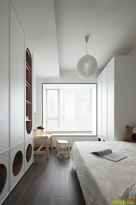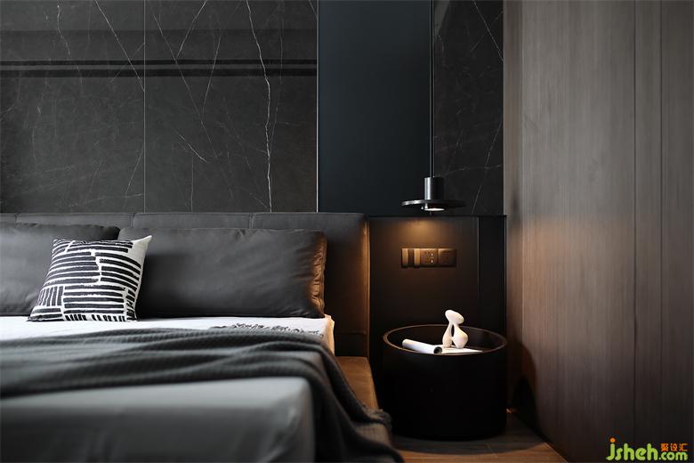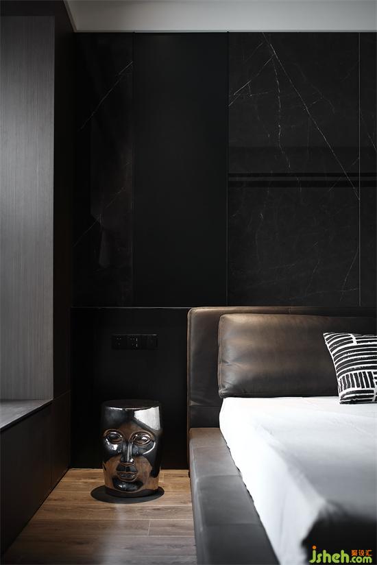 床是提前选好的,与背景墙高度完美契合,家装设计摒弃笨重床头柜,选择时尚别致的边几代替,皮质床头与不锈钢的碰撞,角落里的精致也不放过。