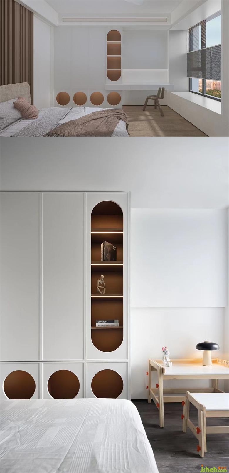儿童房从全屋风格里抽离,奶油白为主色调,更加符合儿童喜好。床周用软垫包裹,家装设计防止磕碰且睡眠更有安全感。