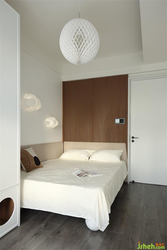 床头背景墙选用木饰面与岩板组合装饰,家装设计层次与质感都更加丰富,床头灯的高度也是符合人体工学的设计,离地面90公分左右,躺在床上玩手机或是看书,不会晃到眼睛。