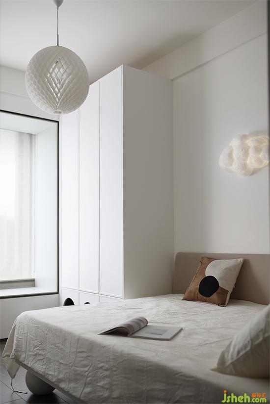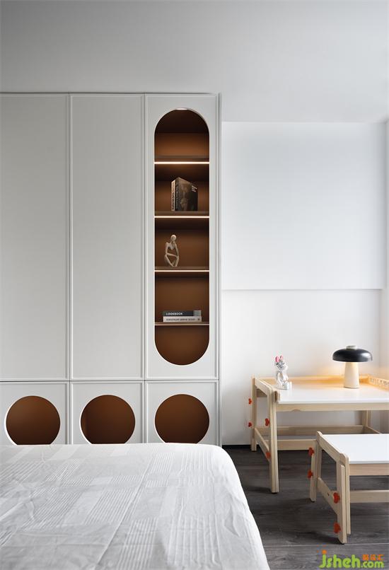 衣柜造型童趣十足,柜门打造柔和弧形,开放格加以灯带点缀,梦幻满满。靠窗摆放儿童桌椅,小巧可爱。