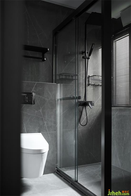 主卫入口也做了隐形门设计,与木饰面包裹的墙面融为一体,家装设计黑色瓷砖通铺地面与墙面,包括五金、置物架以及百叶帘均是黑色,暗黑感被充分彰显。