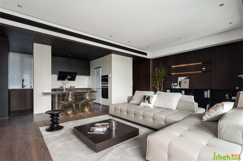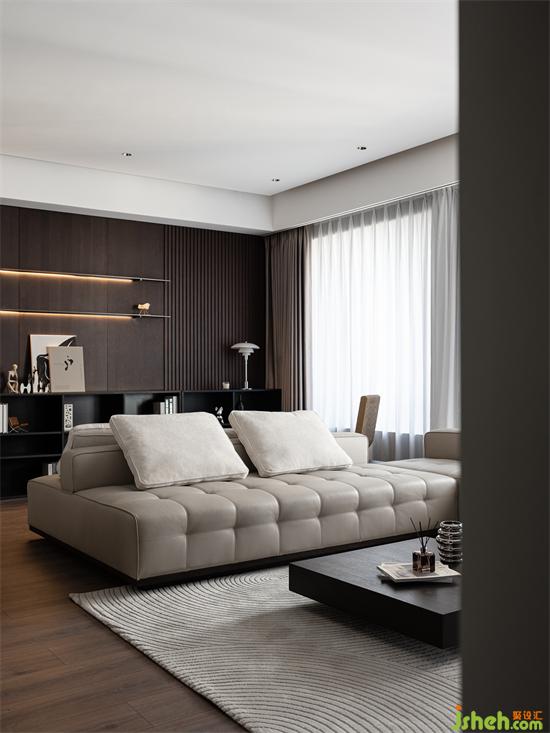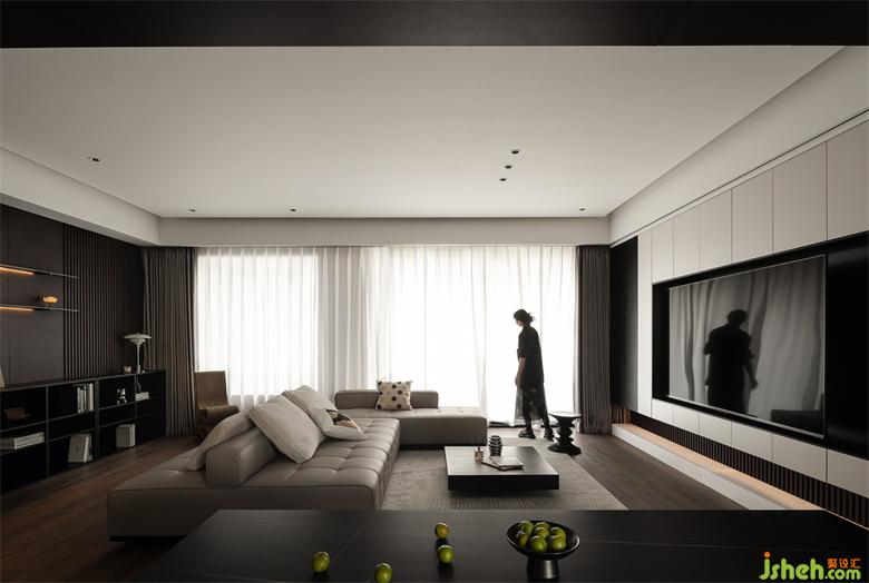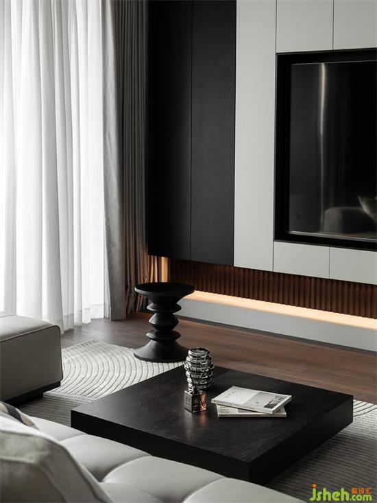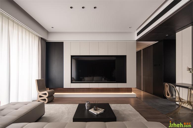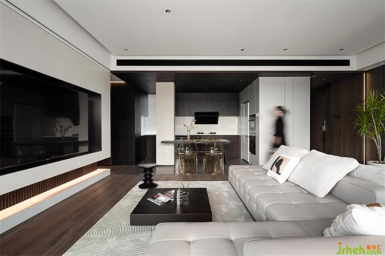 大平顶无主灯设计清爽无比,四周悬空轻盈立体,黑白灰在空间中碰撞出经典与高级,家装设计搭配质感丰富的深色木材,以及不同材质的饰面板,空间流畅且大气。