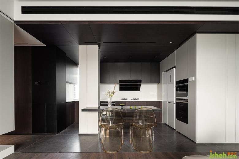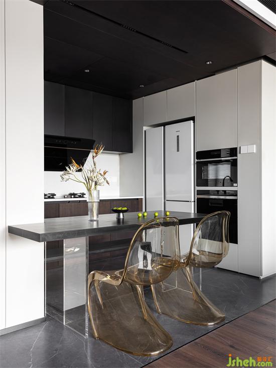 餐桌倚靠梁体,与厨房形成洄游动线,使用过程更加便捷,橱柜深浅不一,再次强调黑白灰的对比,与客厅形成呼应,自然且和谐。