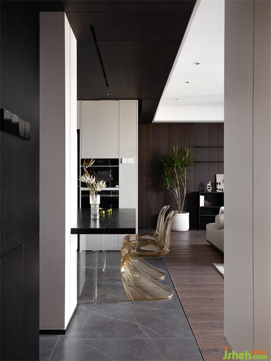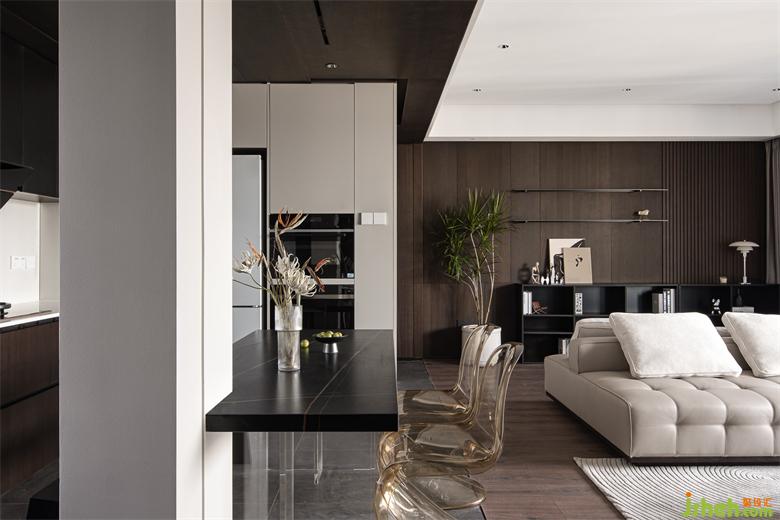 定制餐桌嵌入墙体,黑色岩板桌面时尚大气,家装设计搭配亚克力桌腿轻盈透明,仿佛悬浮一般,化繁为简减轻空间无故的负担,让光影自在流通。
