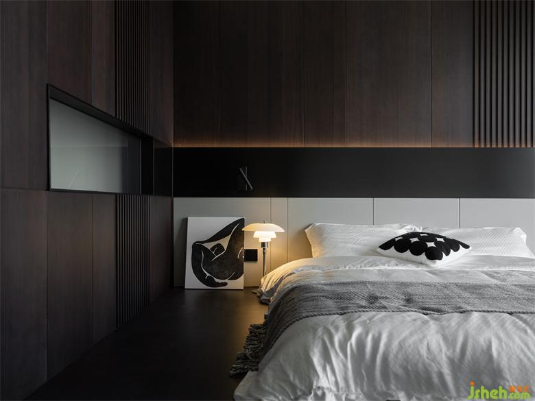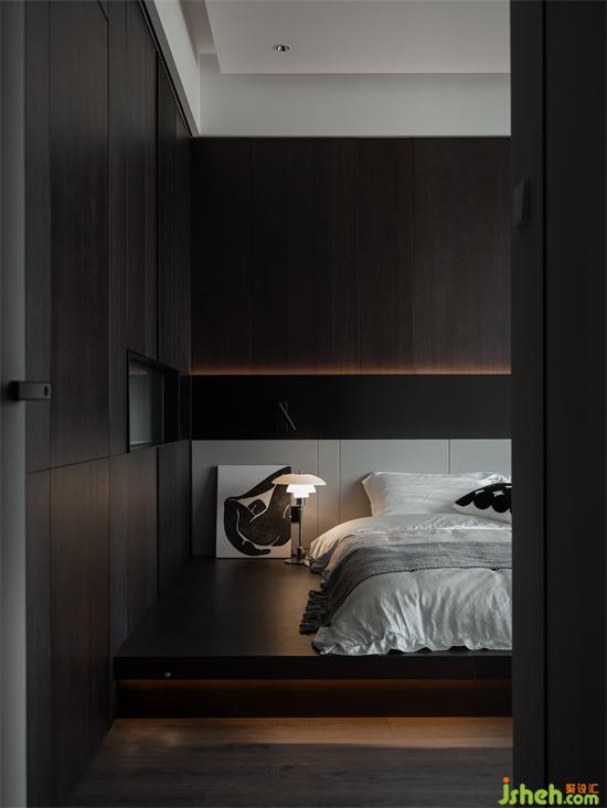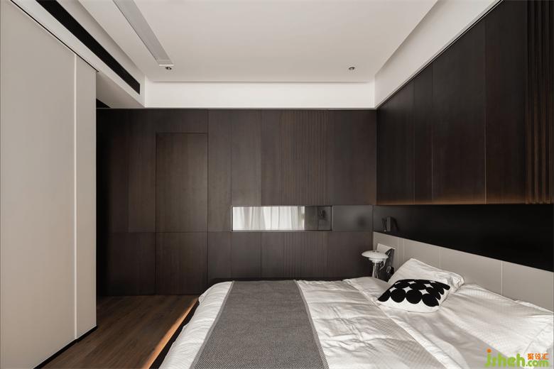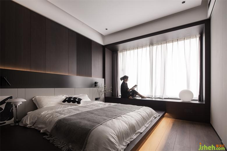 延续公区的深色系,卧室大面积使用深色木材上墙,与整体基调保持统一。主卧的另一大出彩设计是地台床,一体式设计连接飘窗,家装设计床面高度与飘窗齐平,卧室视觉上更加整齐美观。