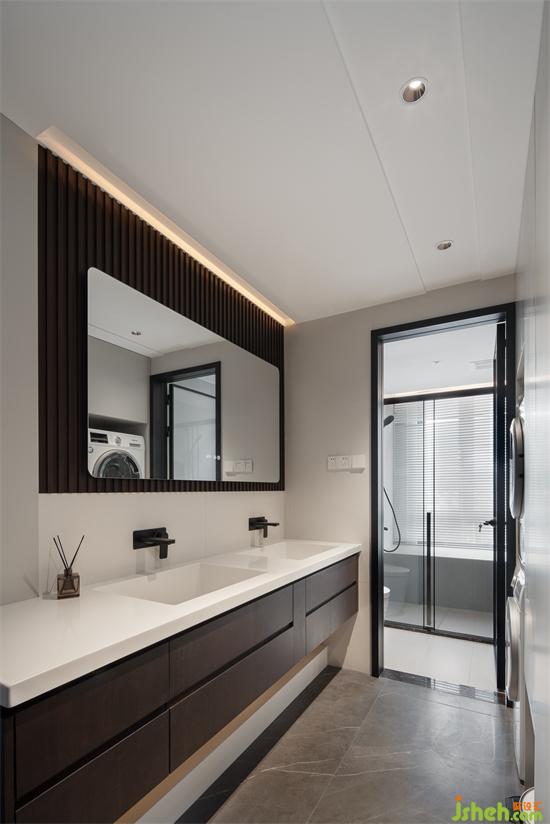 改动之后的客卫无比宽敞,不仅实现了三分离设计,还将家政区容纳于此,一区多用合理便捷。家装设计超长双台盆设计,满足两代人的生活需求,浴室镜背景墙用长城板装饰,与公区形成呼应,独特又美观。