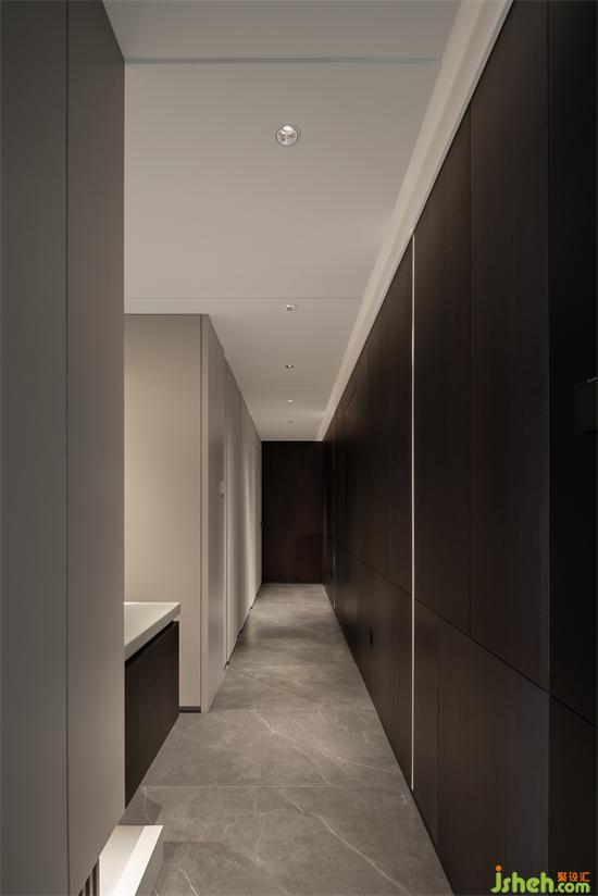 狭长的走廊是此户型的一个特点,以此完成动静分区,走廊连接四间卧室,通过我们的墙面设计,家装设计将卧室入口完美隐形,整体性设计尽显空间大气感。