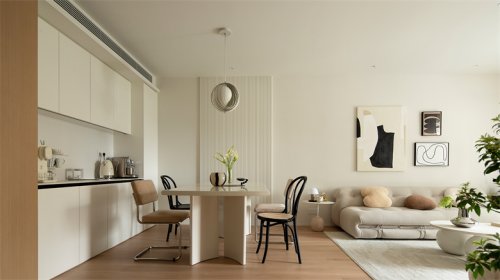 沙发不靠墙,背景墙打造整面储物柜,卧室入口隐藏其中,奶油白一直延伸至餐厅区域,家装设计空间整洁统一,视觉效果更加开阔清爽。