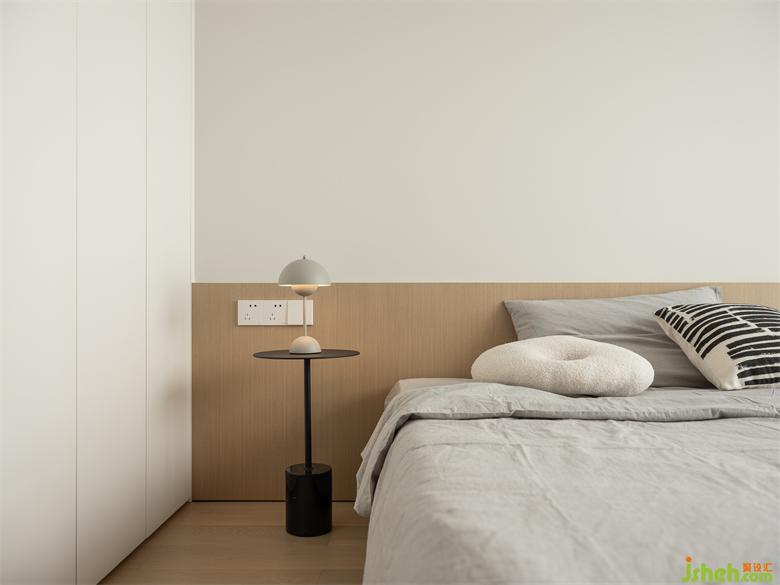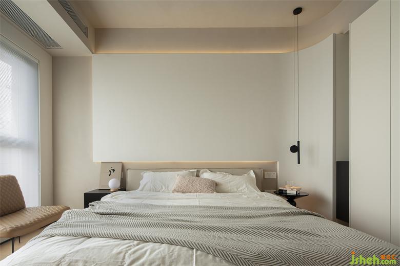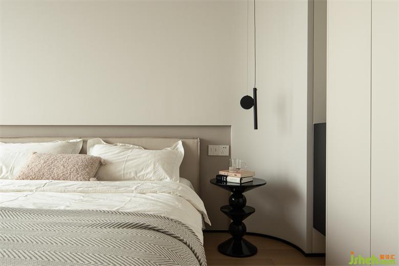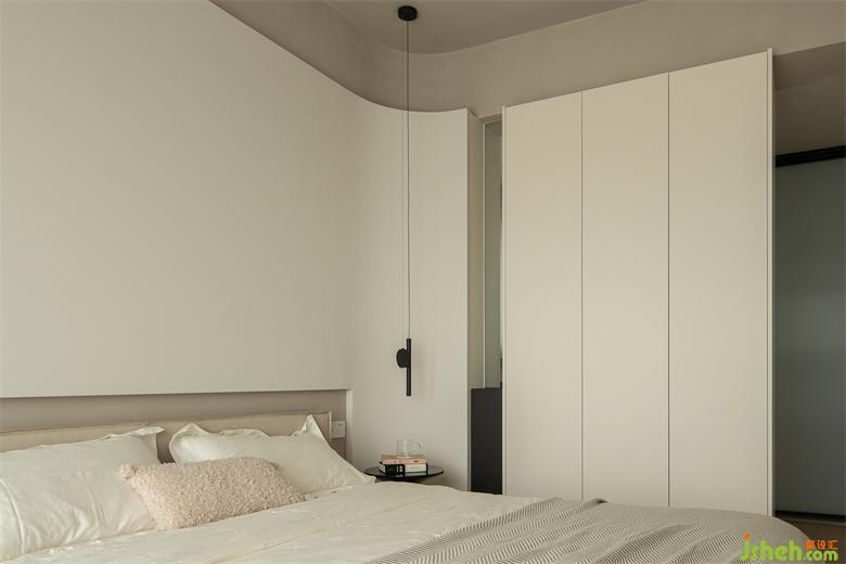 转角以弧面凹槽过渡,流畅温和,睡眠区呈微微包裹趋势,加强温馨的安全感。一盏极简线型吊灯悬挂,搭配同色边几,床头一角被格调填满。