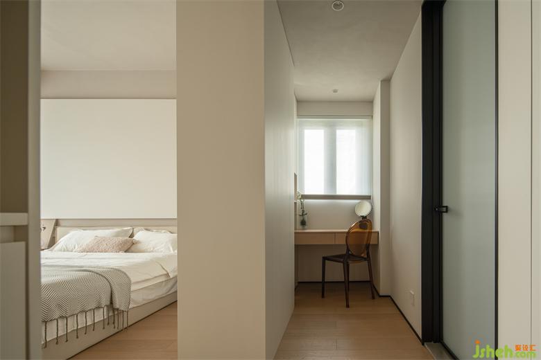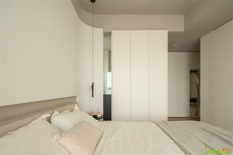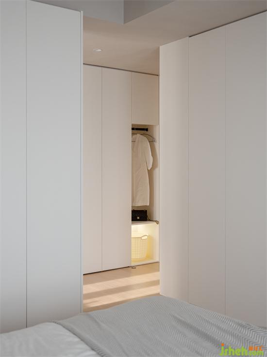 家装设计用衣柜隔断空间,与墙面色调统一,满眼清爽,并能无中生有实现衣帽间功能区,满足业主的大规模衣物收纳。