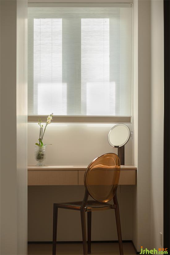 窗边一角独立且温馨,香格里拉帘过滤朦胧光影,氛围舒适温柔。琥珀色亚克力椅子在光线下清透高级,给小角落平添许多美感。