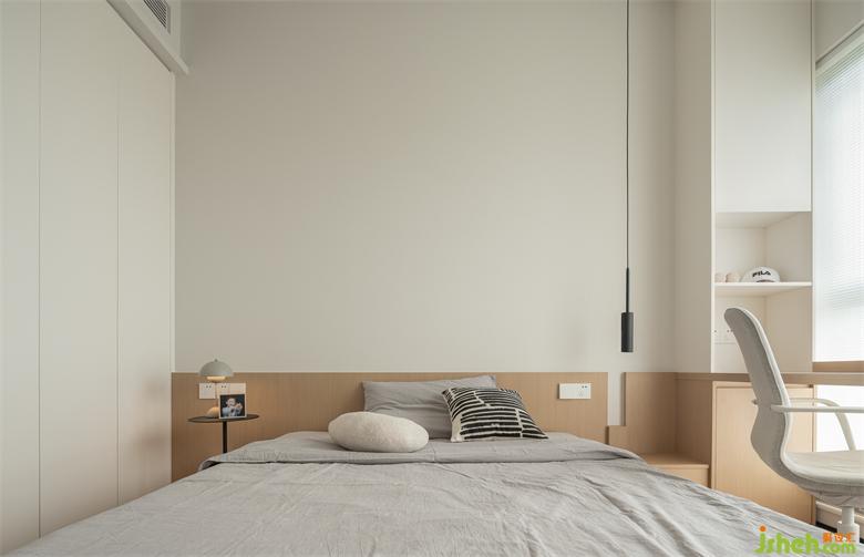 床头打造凸出的奶白色体块造型,上下嵌入灯带,注入温馨氛围的同时,加强空间层次,淡雅却不单调。