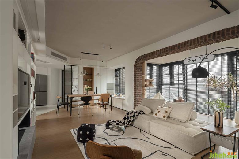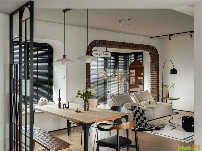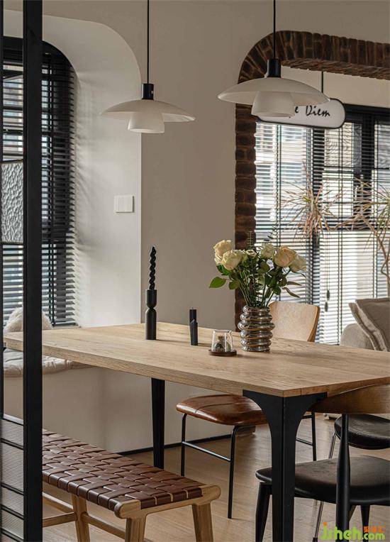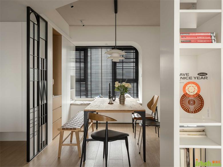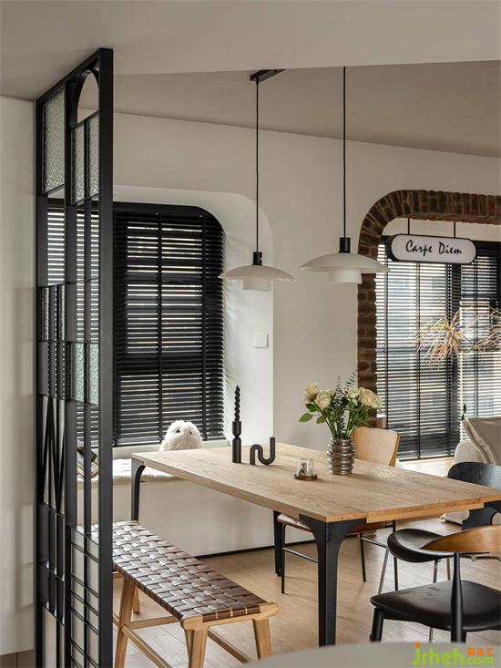 客餐区窗户均为黑色铝百叶,与铁艺屏风形成对照,强调北欧风的工业感,餐桌椅也多以黑色作为点缀,统一空间色调,深圳南山东关乐尚林居家装设计营造和谐大气的风格氛围。