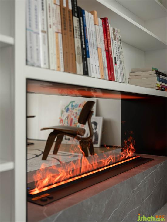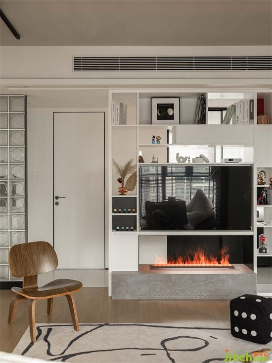 电视下方打造电子壁炉,奠定电视墙的基调,虚空缥缈的火光,注入舒适温暖的家居氛围。