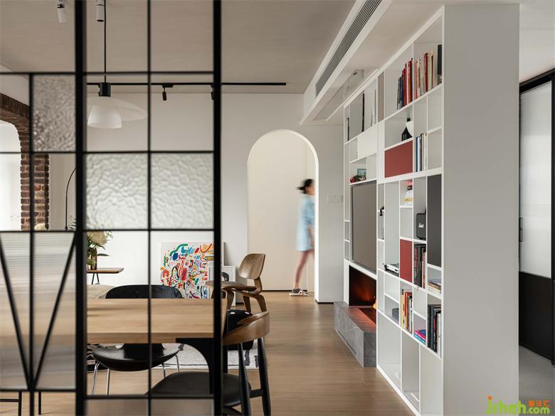 书架亦是展示柜,不同颜色的书籍仿佛跳动的音符,呼应五彩斑斓的装饰画,深圳南山东关乐尚林居家装设计为白色空间带来奇妙的艺术感。
