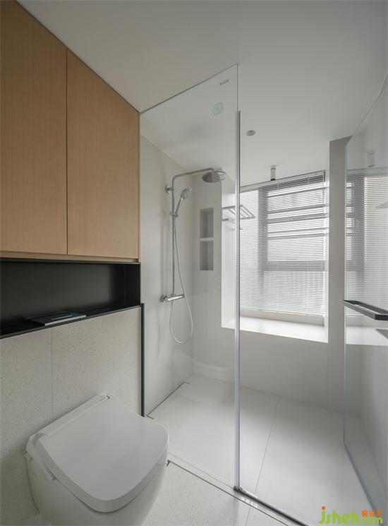 洗漱台外置走廊,与内部一同形成三分离式布局,深圳南山东关乐尚林居家装设计同样的清爽纯白色块,宽敞且光线充足,无论哪个角落均是舒爽之意。马桶上方搭配原木收纳柜,储存卫生间生活用品,便捷实用。