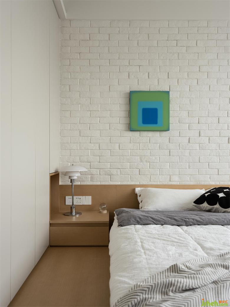 立体感墙皮铺贴床头背景墙,形成原始裸露的白墙效果,深圳南山东关乐尚林居家装设计呼应全屋的北欧风格,让卧室格调更加饱满高级。