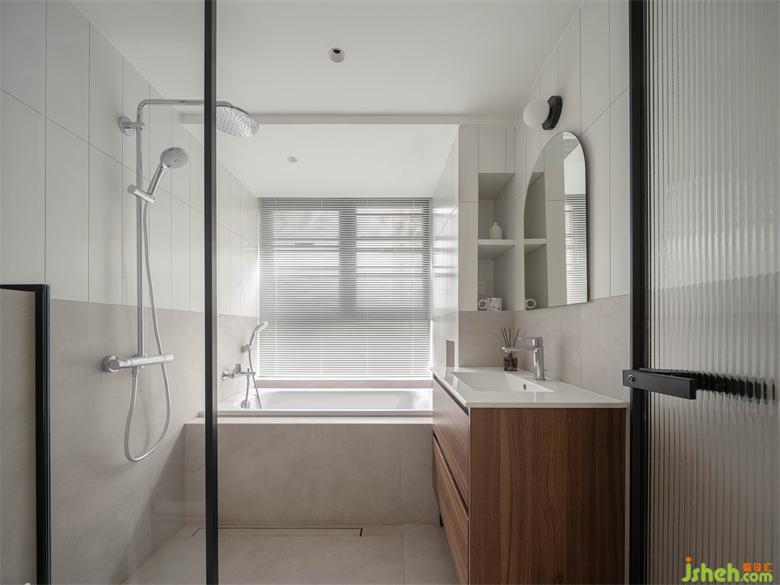 黑框长虹玻璃门作为主卫入口,不影响卧室廊道采光效果,大白砖通铺墙面地面,视觉清爽干净,主卫各项设施一应齐全,淋浴间以及浴缸带来多选择性沐浴体验,提升生活质感。