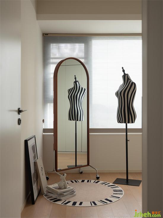 另一间次卧用来当做多功能衣帽间,也是女业主练习瑜伽的区域,翻板床+衣柜的结合创造复合式功能,为空间发挥更多可能性,两墙衣柜满足夫妻二人的所有衣物收纳需求,深圳南山东关乐尚林居家装设计配备可移动式穿衣镜以及人形衣架,让生活的每一面都精致无比。