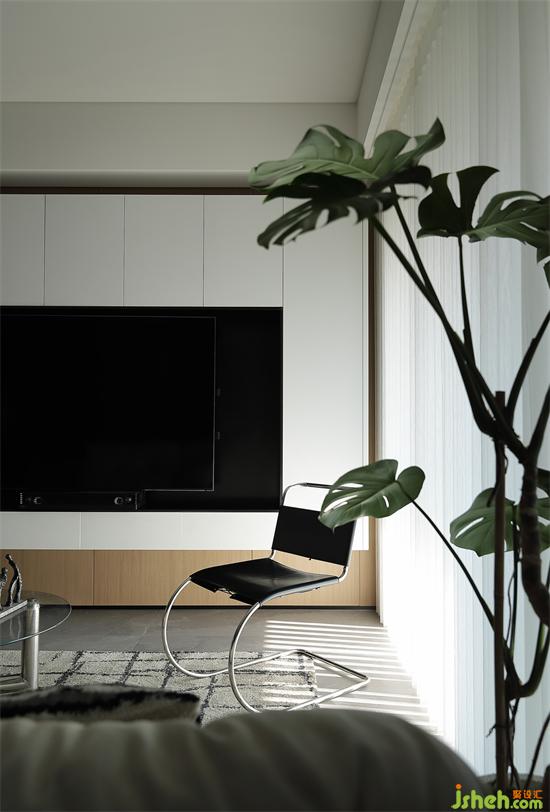 悬浮电视墙轻盈立体,柜体简洁美观,带来丰富的储物空间。深圳天健天骄装修设计线条感单椅彰显极简美学,展现空间气质,梦幻帘分割光影,加上绿植的点缀,客厅空间清透会呼吸。