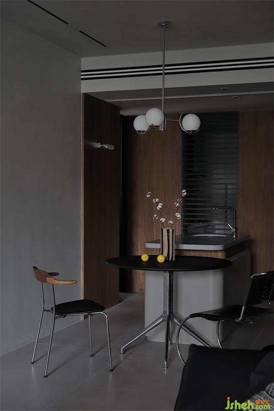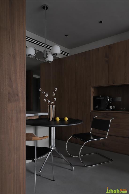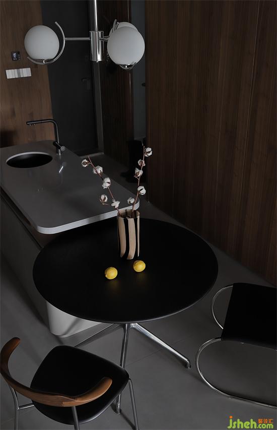层次高级,张弛有度,木纹细腻的纹理被加倍放大,吊灯下的温馨,是专属用餐时刻的舒适,中和灰调的清冷,白天黑夜,家的情绪瞬息万变。