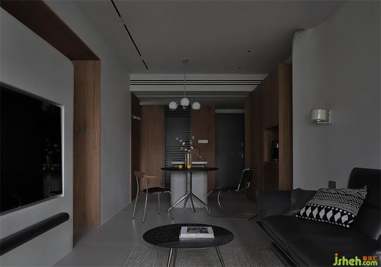 墙顶采用冷灰调微水泥通刷,深色木饰面点缀其中,一横一竖,一刚一柔,体块化的设计强化着空间的挺拔与开阔。