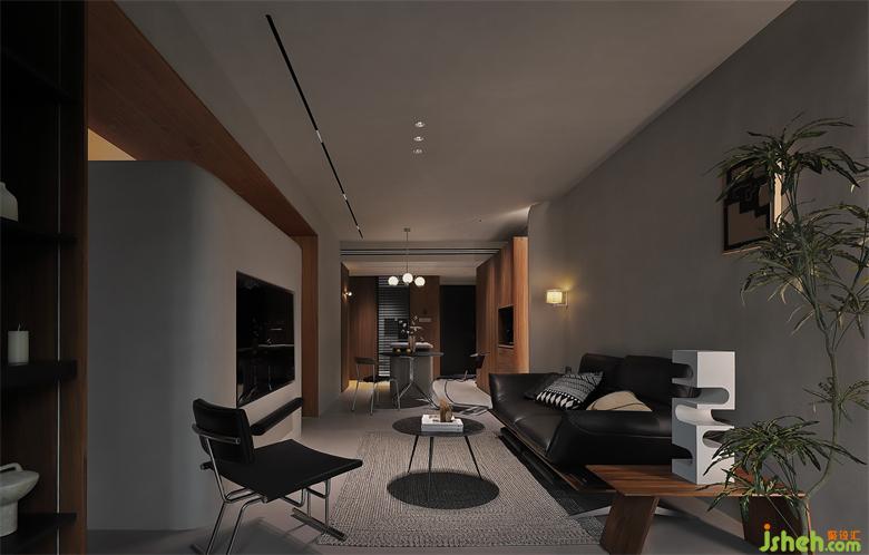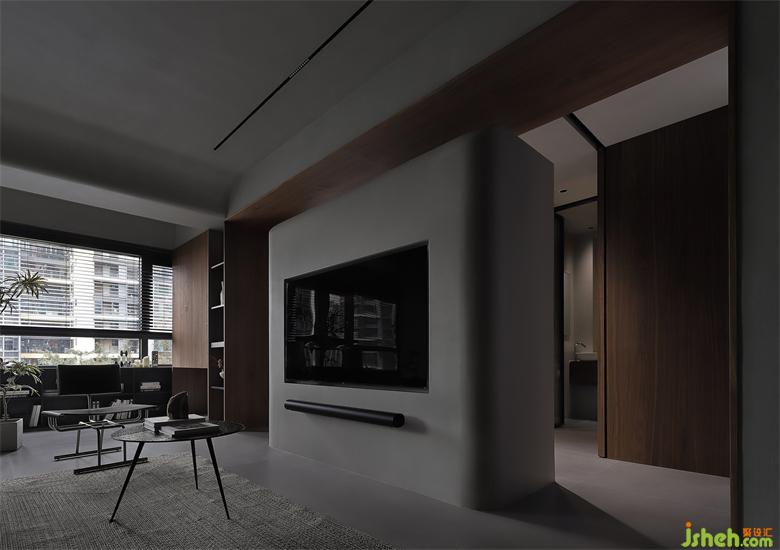 深圳首地容御豪宅设计墙顶采用冷灰调微水泥通刷,深色木饰面点缀其中,一横一竖,一刚一柔,体块化的设计强化着空间的挺拔与开阔。