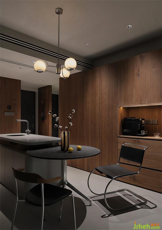 黑色格栅门弱化厨房的存在,精简的一字型布局,冰箱内嵌墙面,橱柜采用镜面不锈钢材质,伴随着射灯清透的光线,赋予厨房满满时尚科技感。深圳首地容御豪宅设计面积不大的小空间采用日式整体厨房设计,收纳与动线十分人性化,小而精的模式是日式厨房最大亮点。