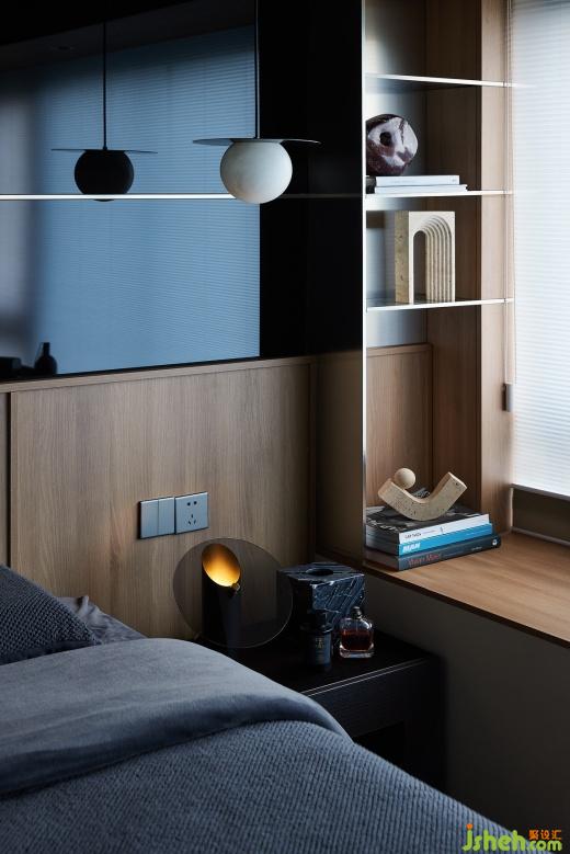 主卧睡眠区延续空间的主色调,床头背景墙采用用黑玻+不锈钢金属条,天花内嵌灯带,营造了一个高格调的睡眠环境同时增加了一份神秘感。