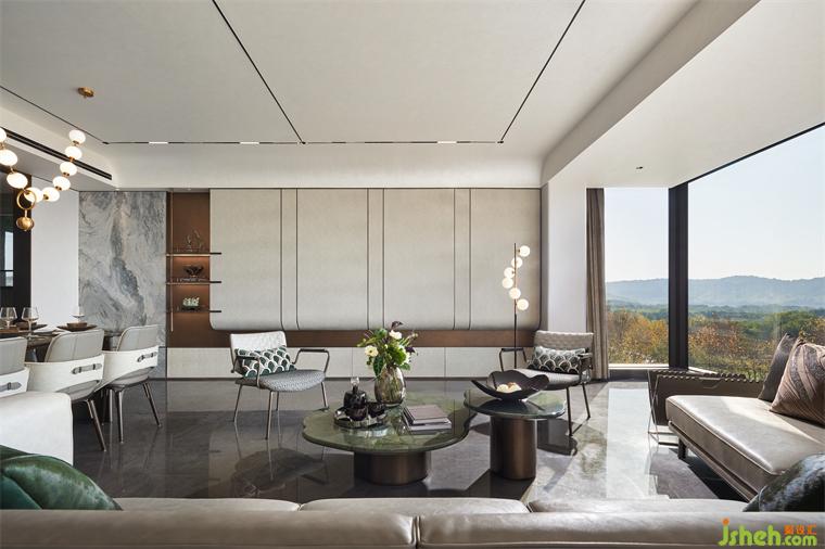 窗外的树木,带来自然气息。空气流动,活跃了整个空间,样板间设计为温馨的家庭生活带来无限的魅力。艾未设计将精致生活的理念、环保的建筑设计概念融入。壮观的山水之境,让人印象深刻。