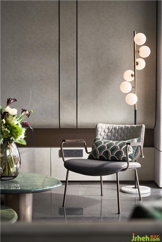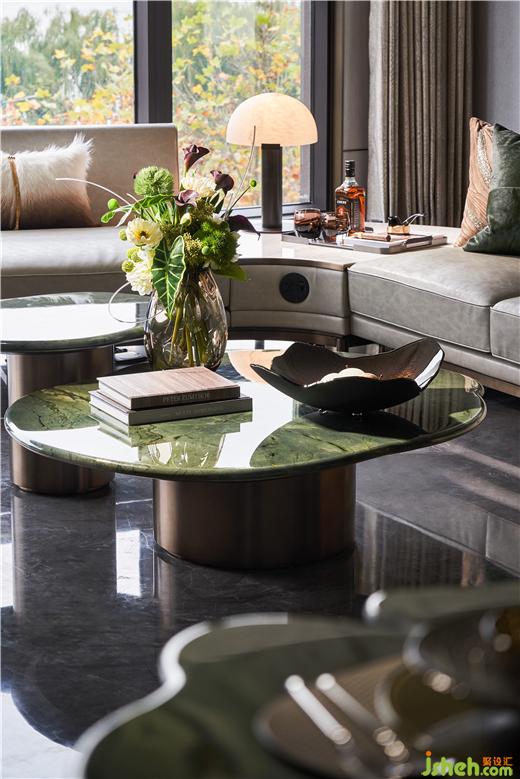 客厅宽阔通透,给家人自由的活动空间,也有山水的灵气,阳光的沐浴。艾未设计将圆润曲面的形态贯穿于整个空间的延续,样板间设计以柔和转折的特点表现内敛、含蓄的美。于微处的细节嵌钢,让全屋充满精致的高级感。