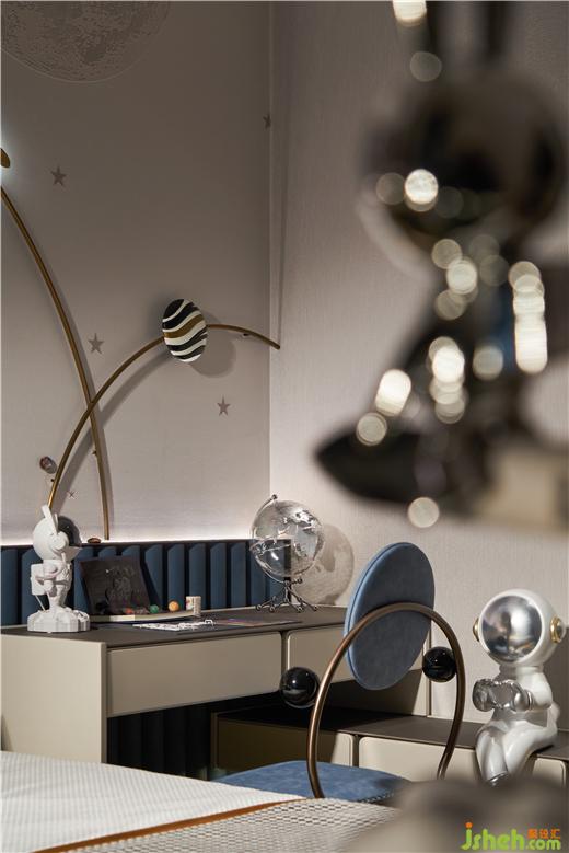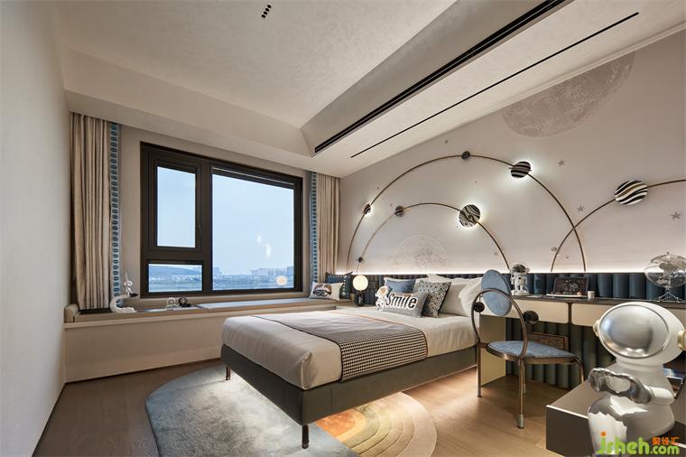 儿童卧室搭配星空之蓝烘托空间场域的基调,样板间设计空间采用无主灯设计,只保留了床头墙板氛围灯,再配上整体灰色系和暖棕色,层次分明,干净又温暖。