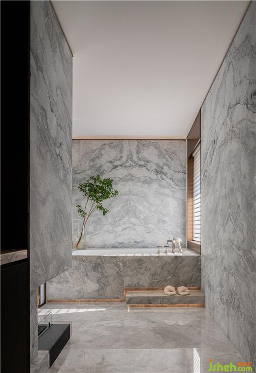灵动、隽永的主卫,以大理石铺就,释放出温煦的自然之美,丰富的光感,舒适的视觉呈现,配合浴缸与壁炉的温馨打造,北京半山别墅设计赋予更高品质与仪式感。