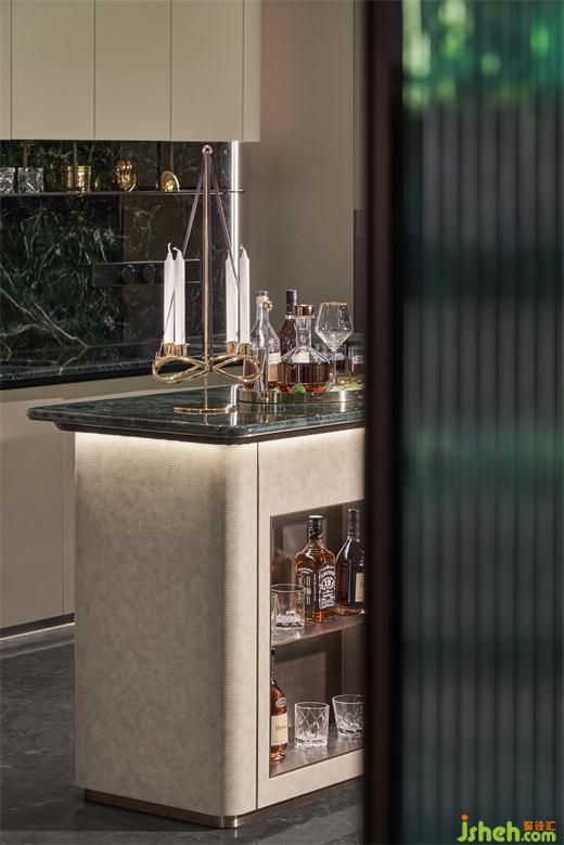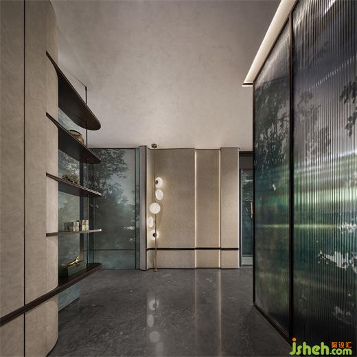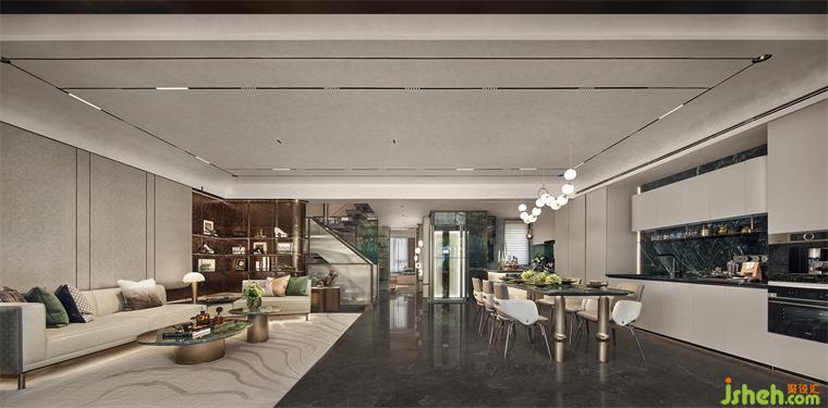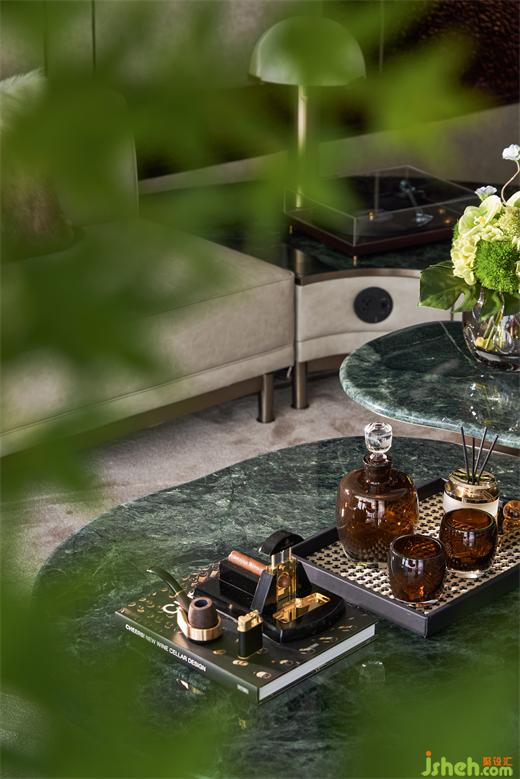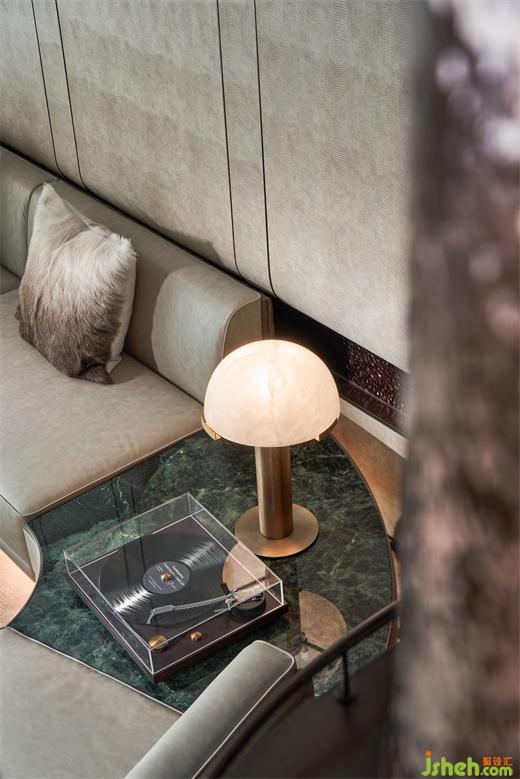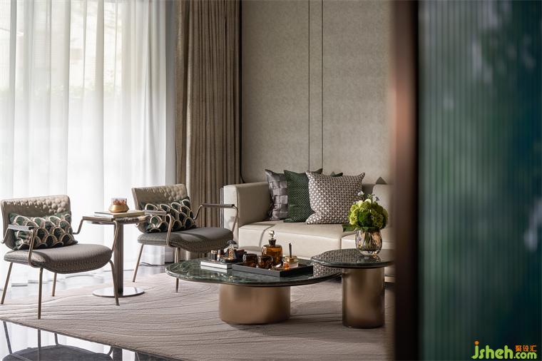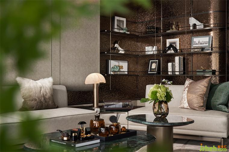 客厅简洁自然,细节灵动。沙发背景以柔和转折的特点,表现内敛含蓄之美,角落嵌钢的开放式展架,打破平淡之余,强调高雅舒适的格调。地毯的纹理模拟水的流动形态,为这处小生态增添一丝趣味。