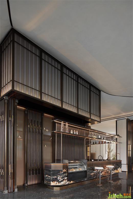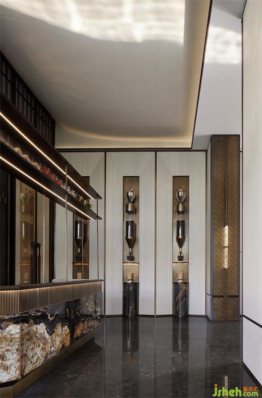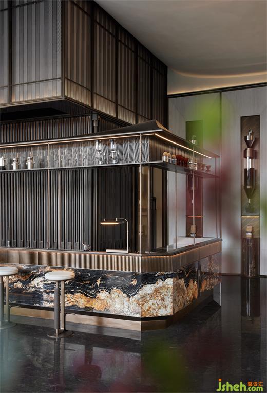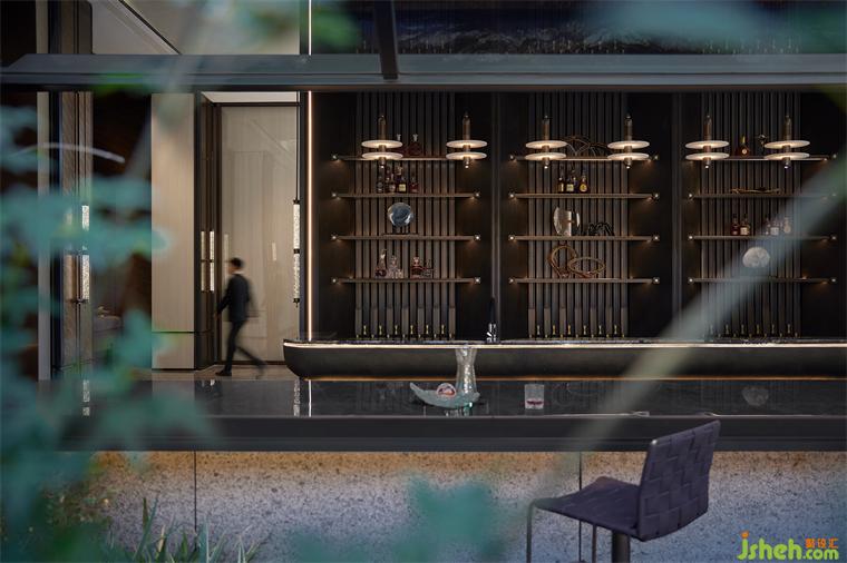 物以载道是中国传统的思想与文化特征。艾未设计亦注重取其形,彰其意,以黑金石材的吧台做底,令金属架化身船桨,在弧形层架的背景之下,一支乌篷船仿佛即将随风启航。