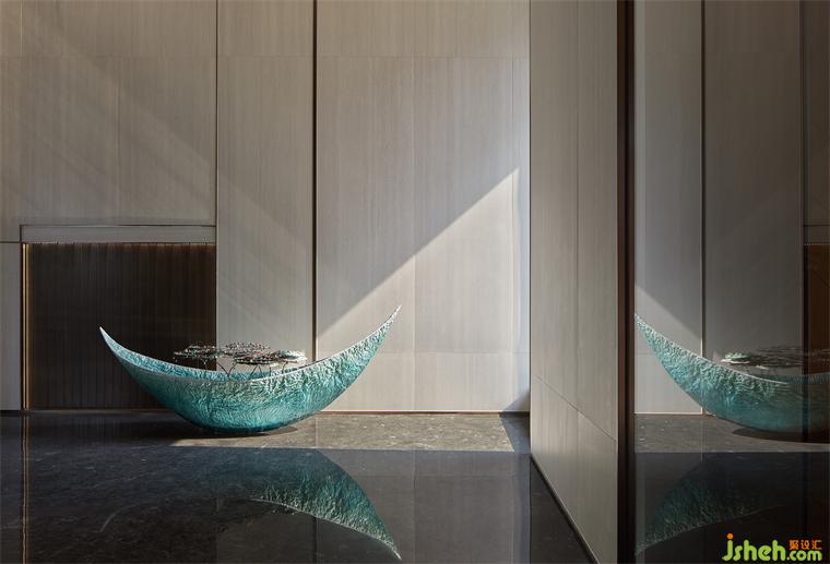 琉璃制作的舟形艺术品则化作路引摇曳,带领观者邂逅更多惊喜,置于其中的朵朵繁花与前厅遥相呼应,悄然刻画在地元素,增添些许灵动姿态。